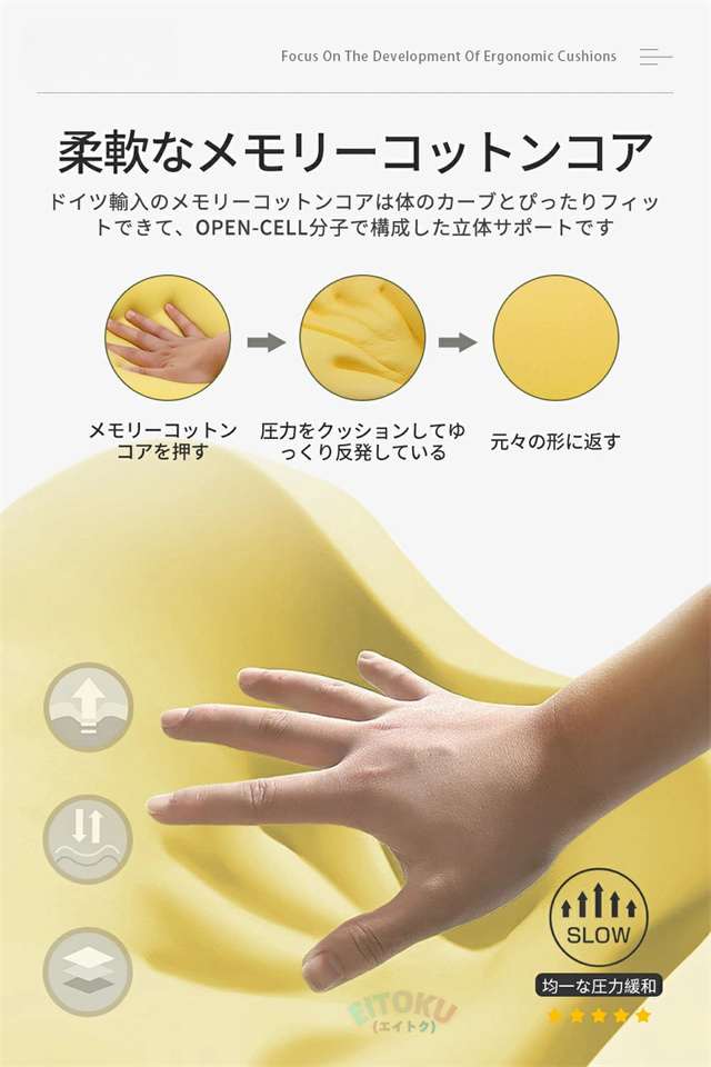 ドイツ産地からのメモリーコットンコアはPEN-CELL分子の立体サポート、柔らかい過ぎず硬い過ぎずの快適感、低反発、変形しないことのような特性があります。サポートパワーおよび耐久性などに関して他の底密度素材より優れています。クッションのカバーは簡単に取り外して、水で洗うことができます。