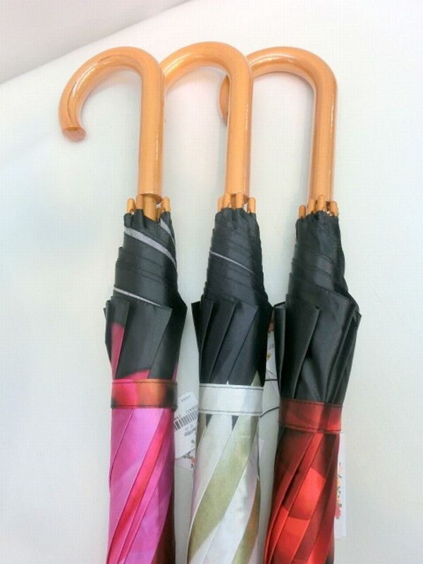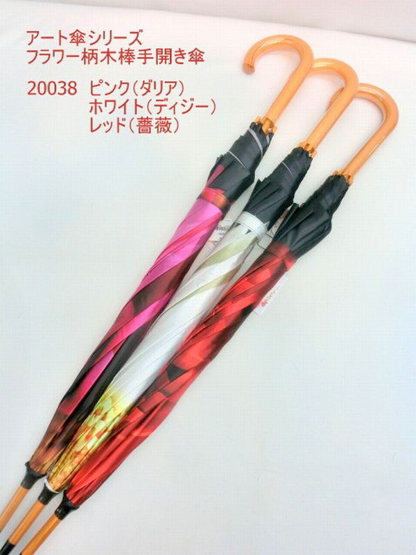 | アート傘シリーズのフラワー柄手開き雨傘です。ダリア(ピンク)、デイジー(ホワイト)、薔薇(レッド)の3柄展開です。 つやつやサテン生地使用、中棒が木製で軽く高級感があります。 |