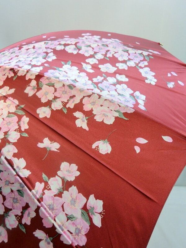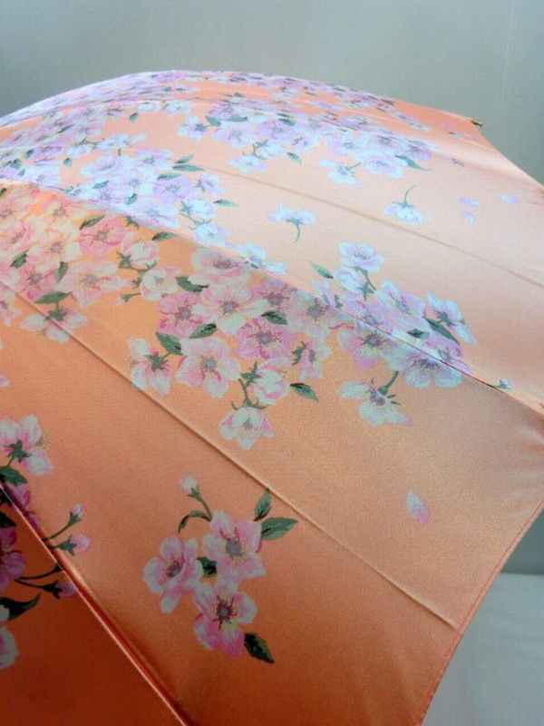 東京プリント・チェリーブロッサム柄の手開き雨傘です。艶のあるポリエステルサテン生地、軽くて強いグラスファイバー製超軽量骨使用。