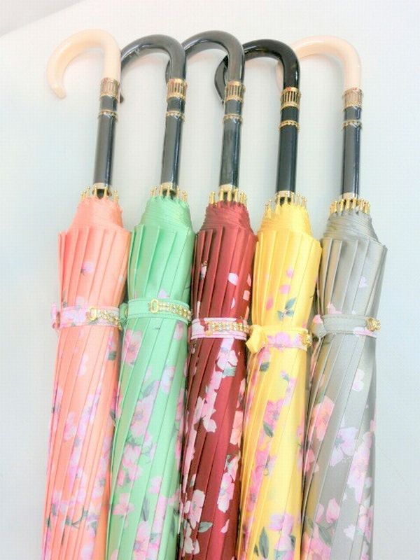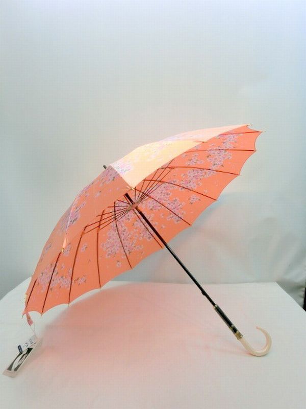 | 東京プリント・チェリーブロッサム柄の手開き雨傘です。艶のあるポリエステルサテン生地、軽くて強いグラスファイバー製超軽量骨使用。 和風16本骨の最高級の日本製商品です。 |