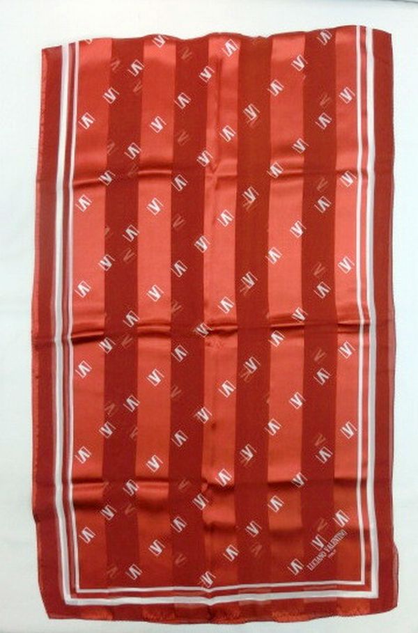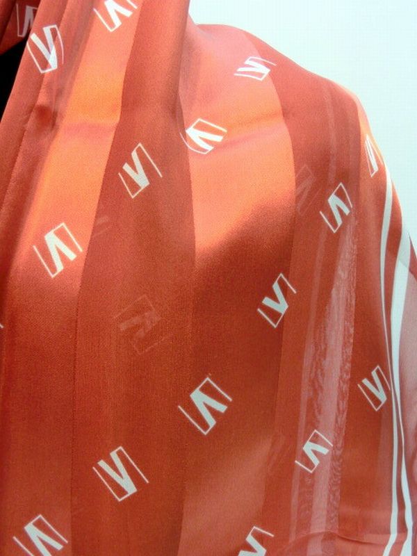 艶感のあるシルクサテンストライブの生地に、ロゴスラッシュ柄をつけたロングスカーフです。大き目サイズなので使い勝手抜群。首もとの秋冬のオシャレにぜひお試しください。