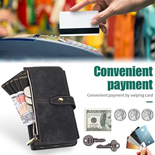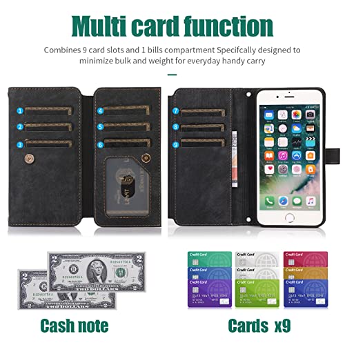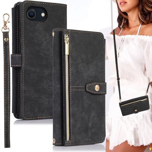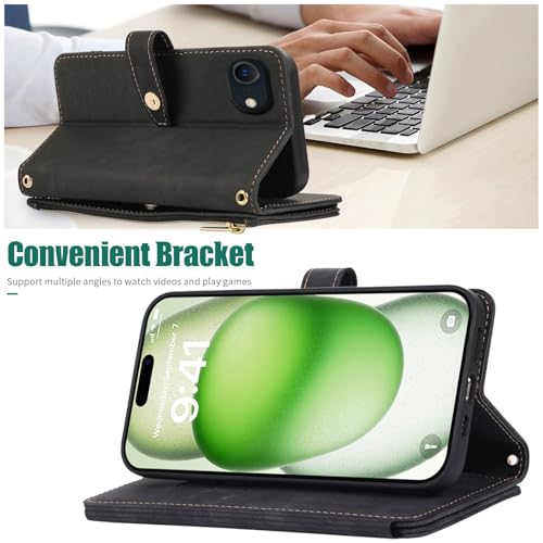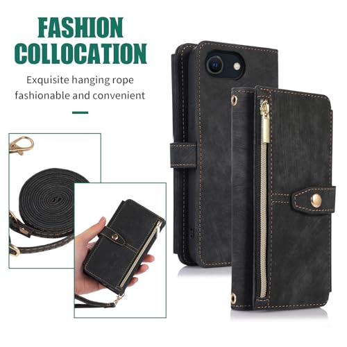 iPhone 16e ケース 手帳型 ショルダー [ ストラップ 二本同梱] アイフォン 16e 手帳ケース 16e 手帳 iPhone16eケース iPhone16eケース iPhone16eケース ショルダーケース ストラップホール付き カード収納 バッグ マグネット 肩がけ 斜め掛け ファスナー ジッパー ストラップ付き スタンド カード入れ レトロ ブラック