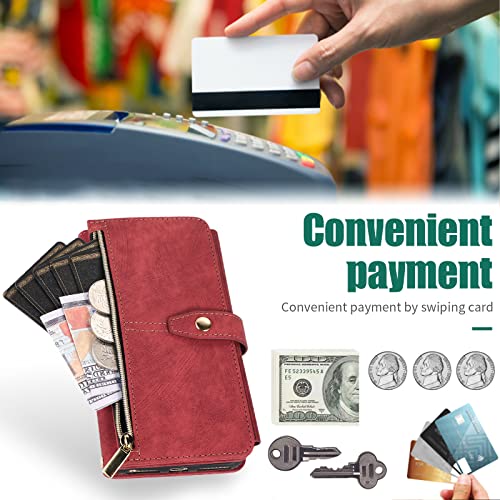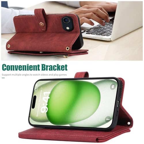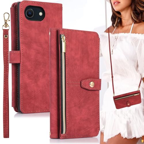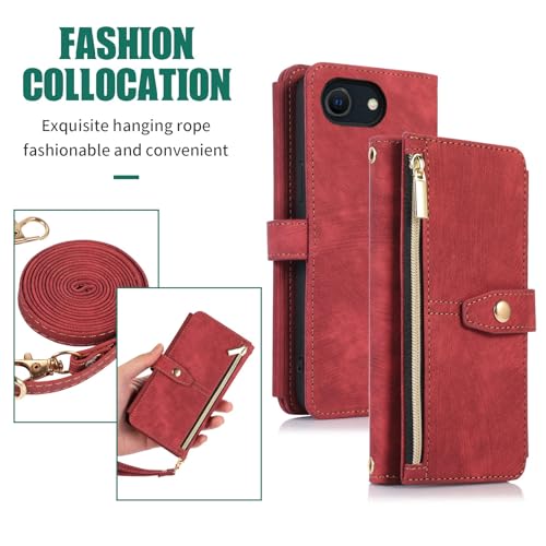 iPhone 16e ケース 手帳型 ショルダー [ ストラップ 二本同梱] アイフォン 16e 手帳ケース 16e 手帳 iPhone16eケース iPhone16eケース iPhone16eケース ショルダーケース ストラップホール付き カード収納 バッグ マグネット 肩がけ 斜め掛け ファスナー ジッパー ストラップ付き スタンド カード入れ レトロ レッド