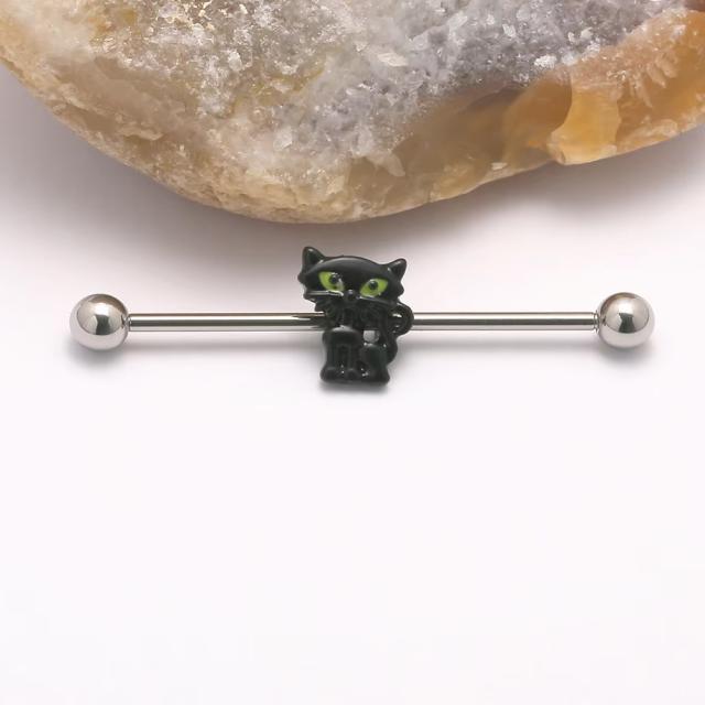 [14G インダストリアル 長いバーベル] ブラックキャット ストレートバーベル 1個販売 14ゲージ ボディピアス メガバーベル メンズ レディース 長い ロングバーベル ピアスをつなぐ サージカルステンレス316L 面白 シルバー 銀色 黒猫 クロネコ 動物 アニマル 可愛い