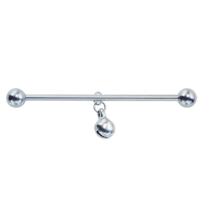 インターナルタイプの長いストレートバーベルの真ん中に鈴のチャームが揺れる14ゲージのインダストリアル用ボディピアス。