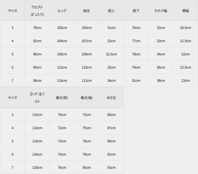 5:ウエスト(ゴム入り) 86cm/ヒップ 108cm/総丈 108cm/股上 32.5cm/股下 78cm/わたり幅 34cm/裾幅 22cm
