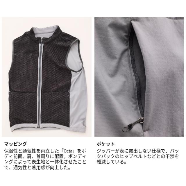 たとえば朝晩の気温が低いときや風が強い日に着用することで、より幅広い温度帯で快適に行動できる、頼りになるベストです。