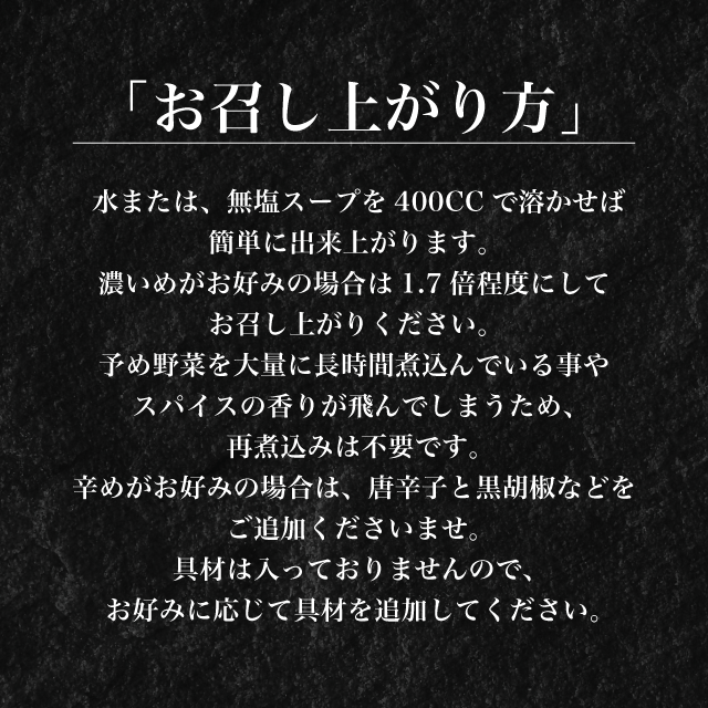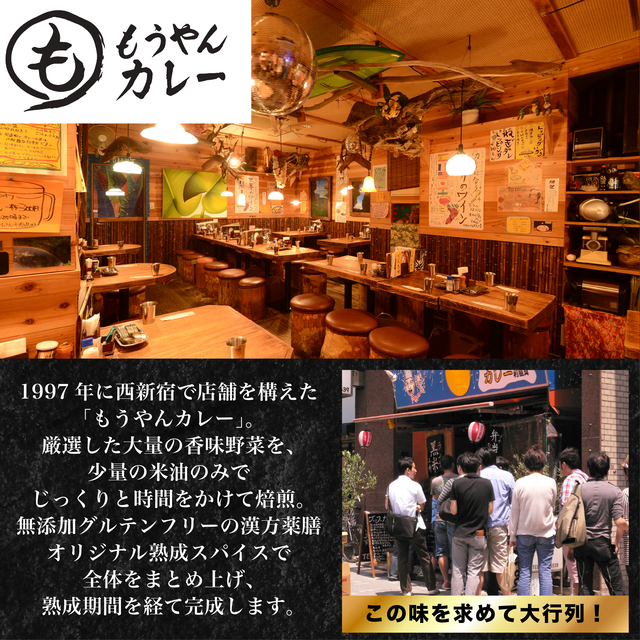 お店と全く同じ味! お湯で溶かすだけの簡単調理でご自宅でもうやんカレーが食べられます!! そのままでも、お好きな具材でオリジナルカレーをお楽しみください 。※具材は入っておりません