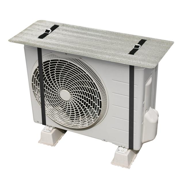 直射日光を反射して室外機を日光から守る室外機の日よけパネルです。室外機が高温になるのを防ぎ、冷房効果が低下するのを防ぎます。室外機が南向きで直射日光が当たる場所に設置してある場合は特に効果を発揮します。