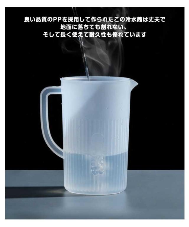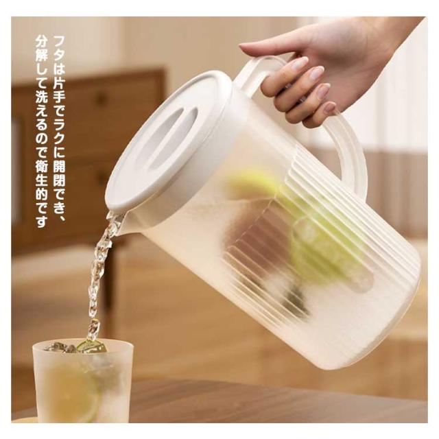 | 冷蔵庫の棚に置きできる冷水ポット 良い品質のPPを採用して作られたこの冷水筒は丈夫で地面に落ちても割れない、そして長く使えて耐久性も優れています フタは片手でラクに開閉でき、分解して洗えるので衛生的です シンプル構造でパーツが少なく、広口で奥まで手が入るので、お手入れ簡単にもうれしいポイント。 暑い季節には水出しアイスコーヒーやお茶などでのご利用も大変便利です。 大容量なのにスリム設計。 | |
