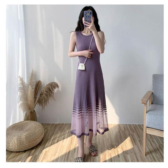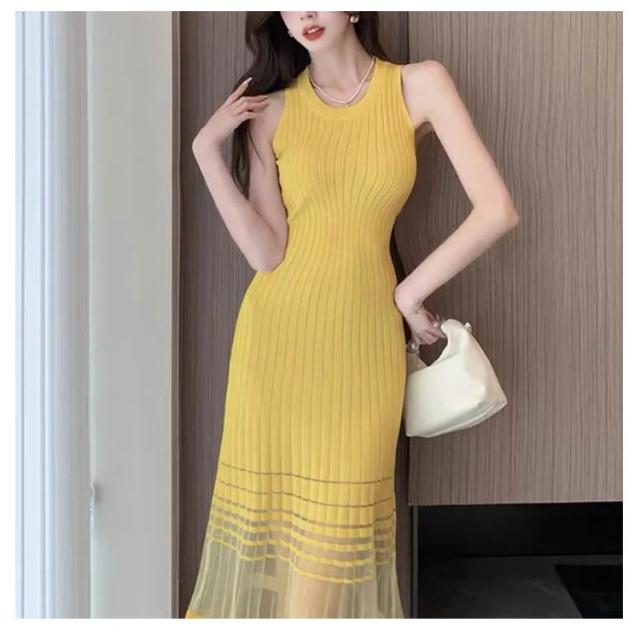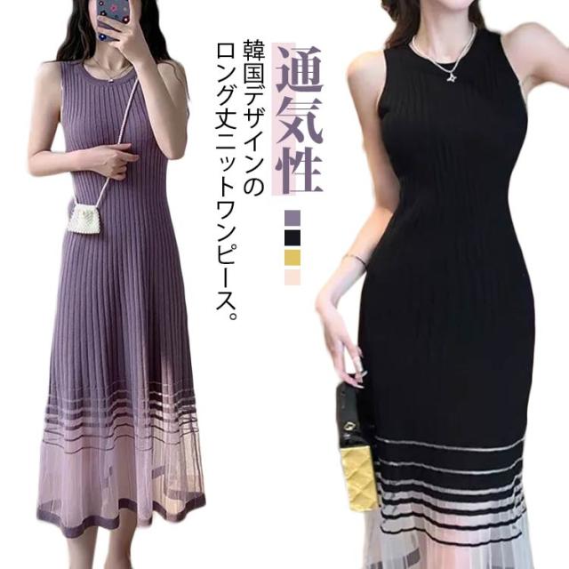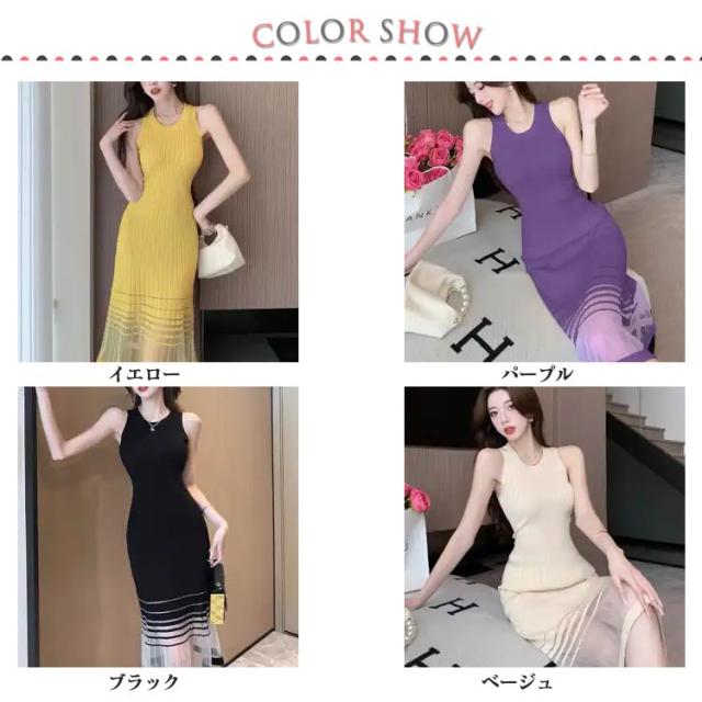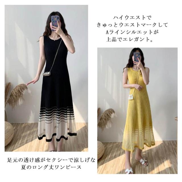 レディース インナーワンピース ワンピース キャミソールワンピース 薄手 ノースリーブ 異素材切り替え 無地 サマーニット ニットワンピース Aライン セクシー リブ 通気性 ストレッチ 清涼感 ノースリーブ リブニット シンプル おしゃれ