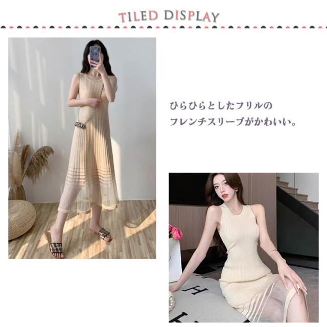 | 韓国デザインのロング丈ニットワンピース。 ひらひらとしたフリルのフレンチスリーブがかわいい。 ハイウエストできゅっとウエストマークしてAラインシルエットが上品でエレガント。 足元の透け感がセクシーで涼しげな夏のロング丈ワンピース | |