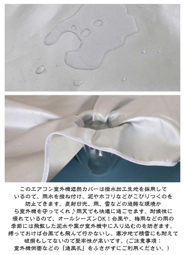 | オックスフォードの生地(撥水加工)厚みのある構造でエアコン室外機をしっかり守ります。エアコンの設置に必ず必要な室外機は、屋外に設置するため、むき出しで放置しておくと、夏場の直射日光や、冬の積雪、激しい雨や強風など様々な悪天候によりトラブルを招くことがあります。このエアコン室外機カバーがあれば室外機を悪天候から守ります。 エアコンの室外機を直射日光から保護するカバーは、紫外線だけでなく雨やホコリなども防いでくれるとともに、室外機自体の老朽化防止効果も期待できます。室外機カバーがあれば室外機を悪天候によるトラブルから簡単にガードできます。この改良した室外機カバーでは、網も付いてあり、飛散した葉やゴミが室外機の中に入り込むのを防ぎます。 シルバー光反射素材を採用、熱線をカットし、冷房運転中の室外機の負担を軽くする!直射日光から室外機を守り、 冷房効率のUPを助けます。エコ・節電も期待できる優れな製品です。 省エネ最新設計のエアコン室外機カバーは、厚みのある構造でしっかり断熱直射日光を遮り、廃熱効果が高まりますので節電・省エネ対策になります。設置し易く、取り外しも簡単です。固定用紐があって縛ることによって取付固定されます。また使用しない時にはコンパクトに収納でき、劣化して処分する際も便利です。 このエアコン室外機遮熱カバーは撥水加工生地を採用しているので、雨水を撥ね付け、泥やホコリなどがこびりつくのを防止できます。直射日光、雨、雪などの過酷な環境から室外機を守ってくれ♪雨天でも快適に過ごせます。耐候性に優れているので、オールシーズンOK!台風や、梅雨などの雨の季節には飛散した泥水や葉が室外機中に入り込むのを防ぎます。縛っておけば台風でも飛んで行かないし、寒冷地で積雪にも耐えて破損もしてないので堅牢性が高いです。(ご注意事項:室外機側面などの「通風孔」をふさがずにご利用ください。) | |