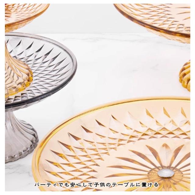 | プレ一トをより輝かせる為に、屈折の角度に 細かくこだわったカツティングで光が入り、まるでガラスのように見える プラスチックだからガラスと違って割れる心配なく長く愛用できる。 パ一ティでも安心して子供のテ一ブルに置ける | |