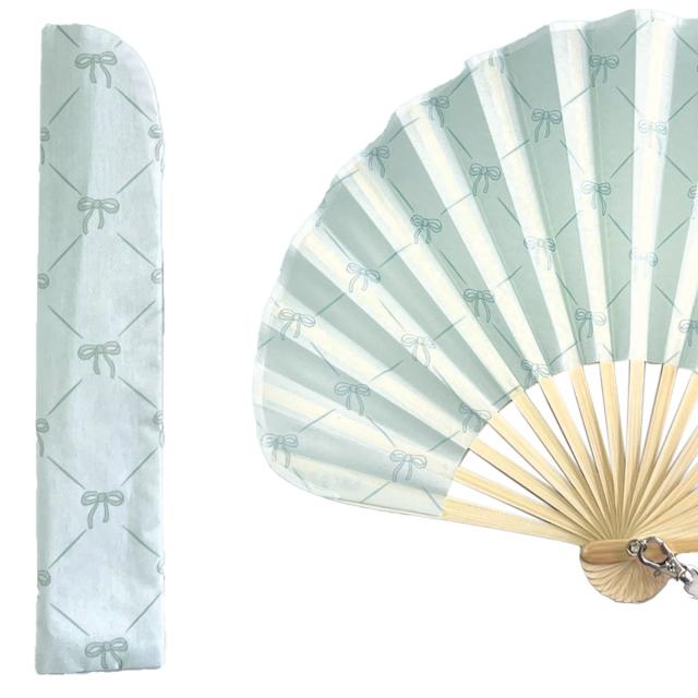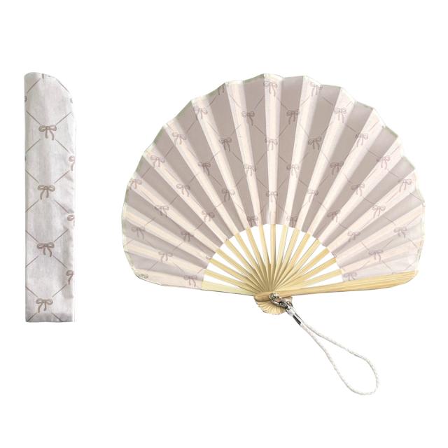 扇子の扇面(地紙)とケースには、お揃いのデザインが施されています。リボン柄が散りばめられており、とってもキュートですが、程良い光沢が上品な華やかさを感じさせる扇子&ケースのセットです。