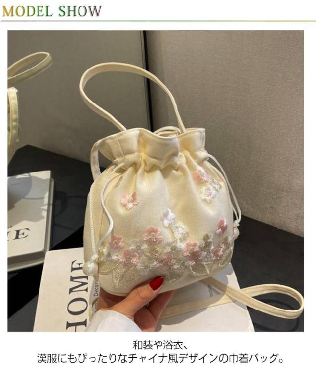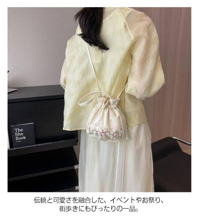 布製 おしゃれ 巾着バッグ ミニバッグ レース刺繍 ポシェット ショルダー お祭り ショルダーバッグ 斜めがけ 手提げ 和装バッグ チャイナ風 漢服 着物 振袖 浴衣用 花火大会 巾着バッグ 卒業式