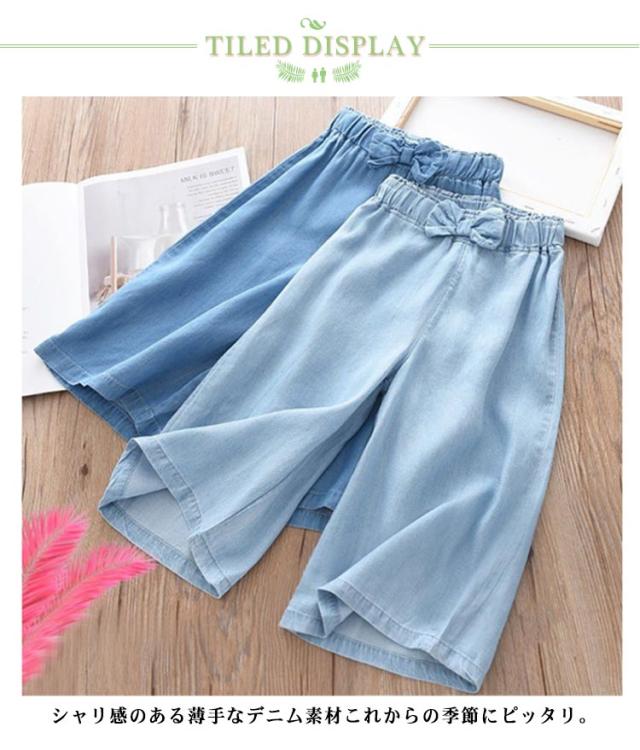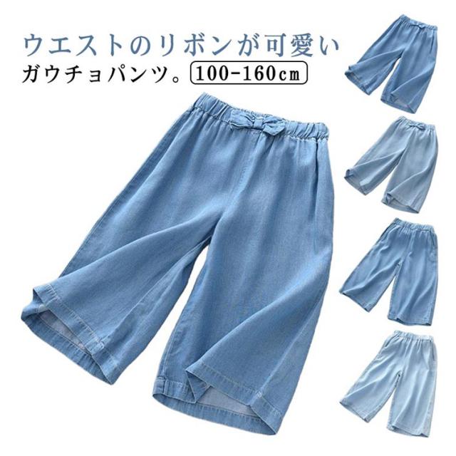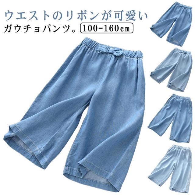 ワイドパンツ 無地 七分丈 ワイドパンツ 女の子 クロップドパンツ ウエストゴム ガウチョパンツ スカーチョ デニムパンツ リボン 送料無料 カジュアル ナチュラル キッズ キッズ ガウチョパンツ 春夏 スカンツ ボトムス ゆったり