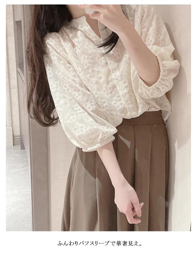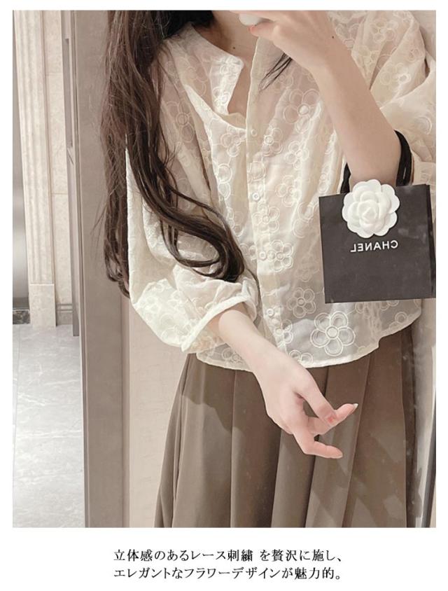 ブラウス シアーブラウス パフスリーブ レース刺繍フラワー 透け感 レディース シャツ レース刺繍フラワー 春夏 トップス 七分袖 ゆったり カワイイ フェミニン