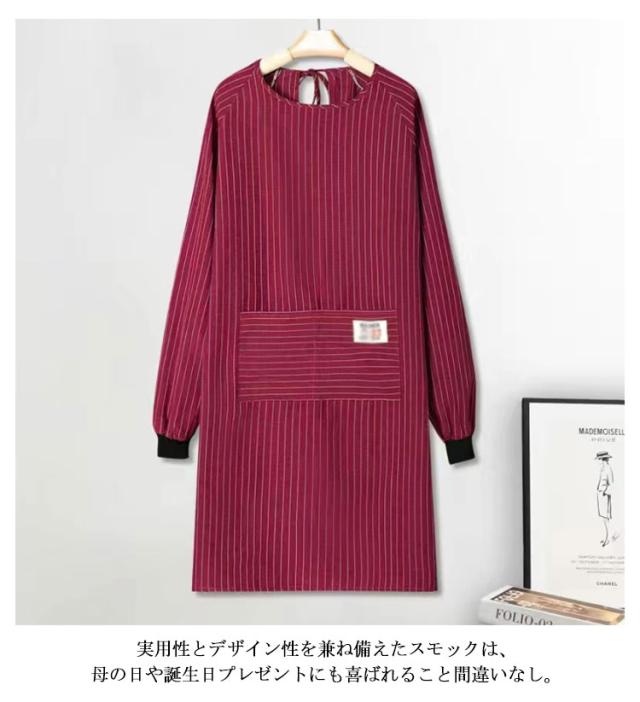 | 袖付きのロングエプロンだから、油跳ねや水しぶきも気にせず作業に集中できます。袖はゴム入りでズレにくい仕様 ユニセックスデザインで、男性も女性も着用OK! 人気の韓国スタイルを取り入れた可愛いデザイン。ストライプ柄で清潔感があり、シンプルながらも存在感抜群! 防汚加工のあるポリエステル混素材で、洗濯機で丸洗い可能!毎日の家事や仕事にもぴったりのタフな1枚 料理、掃除、ガーデニング、保育など様々なシーンで活躍!家庭用はもちろん、飲食店や作業場にも最適です。 実用性とデザイン性を兼ね備えたスモックは、母の日や誕生日プレゼントにも喜ばれること間違いなし。 | |