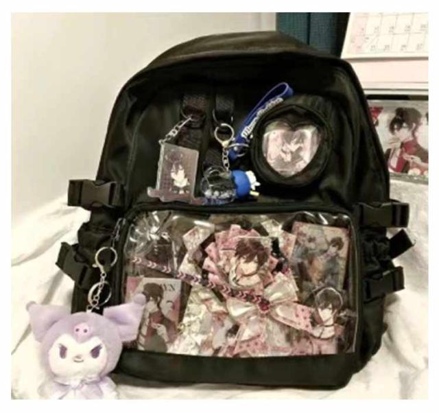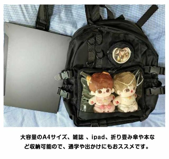 | 缶バッジやぬいぐるみなど推しのグッズを入れて一緒にお出かけできる大容量の痛リュック フロントに透明ポケットで見せたいアイテムを自由にアレンジできます。 好きなアイドルやキャラクターの写真、缶バッジ、ぬいぐるみ、萌グッズなど入れて一目瞭然。 大容量のA4サイズ、雑誌 、ipad、折り畳み傘や本など収納可能ので、通学や出かけにもおススメです。 普段使いはもちろん、アイドルやアニメの推しイベントでも大活躍。 | |
