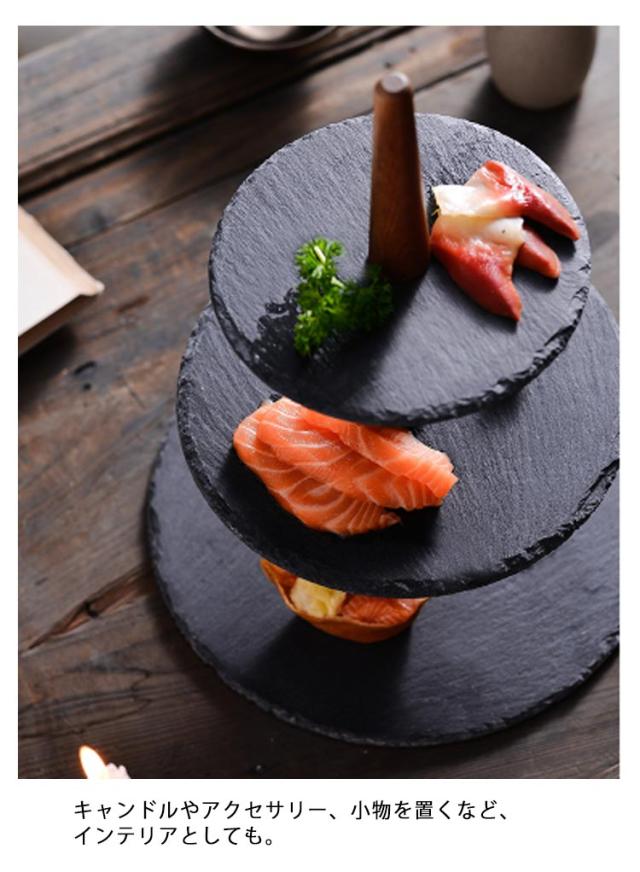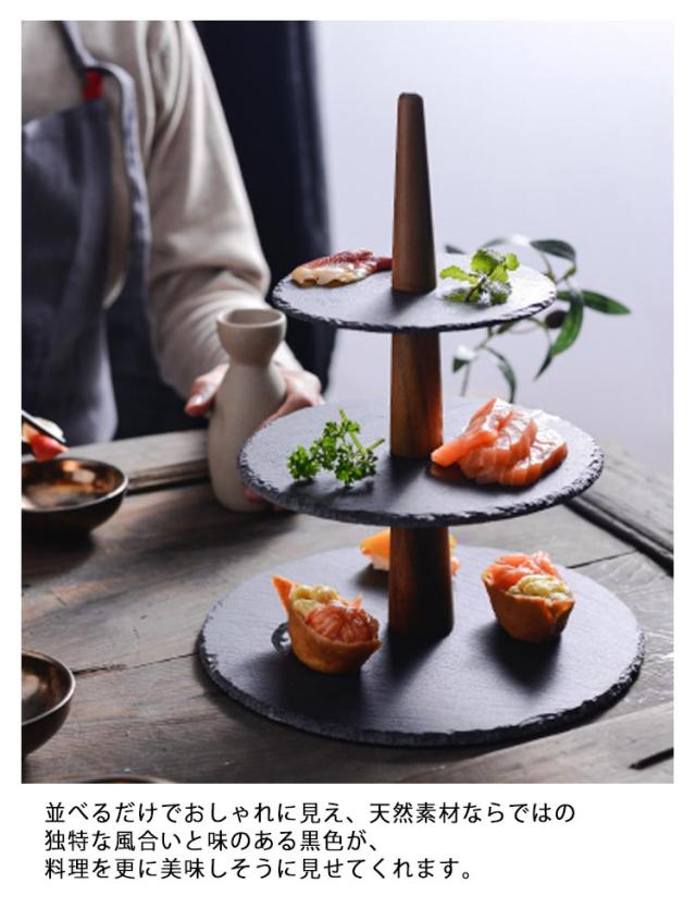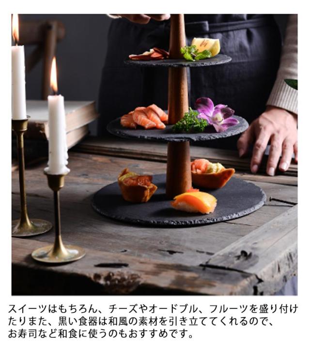 | おしゃれなカフェやダイニングで見かける、黒いプレート。スレートプレートのアフタヌーンティースタンドです。 並べるだけでおしゃれに見え、天然素材ならではの独特な風合いと味のある黒色が、料理を更に美味しそうに見せてくれます。 スイーツはもちろん、チーズやオードブル、フルーツを盛り付けたりまた、黒い食器は和風の素材を引き立ててくれるので、お寿司など和食に使うのもおすすめです。 キャンドルやアクセサリー、小物を置くなど、インテリアとしても。 テーブルコーディネートや、ディスプレートレーのアクセントに! | |