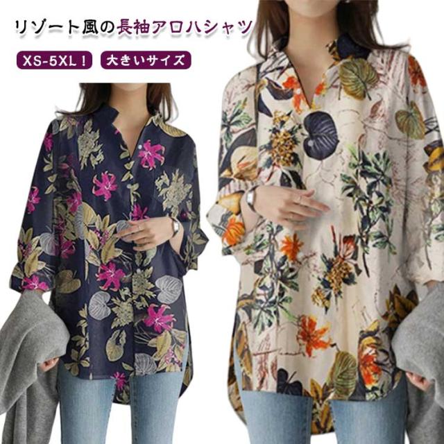 長袖 おしゃれ レディース アロハシャツ 大きいサイズ ハワイシャツ フラワー柄シャツ カジュアルシャツ ハワイ 開襟シャツ アロハシャツ アロハトップス リゾート サマーウエア 夏 夏服 総柄