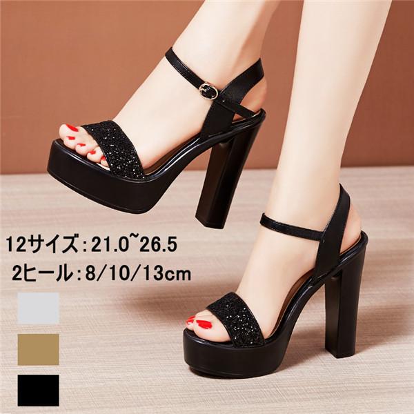 サンダル レディース 厚底 太ヒール ベルト ハイヒール ストーム サンダル ヒール8/10/13cm 靴 女性 ブラック シルバー ゴールド
