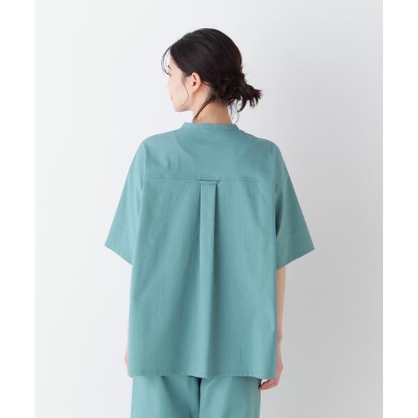 スキッパータイプのブラウスをゆったりとしたサイズ感で作りました。細めのバンドカラーはステッチを効かせたデザインです。後丈を長めにしてヒップもカバーする丈感です。