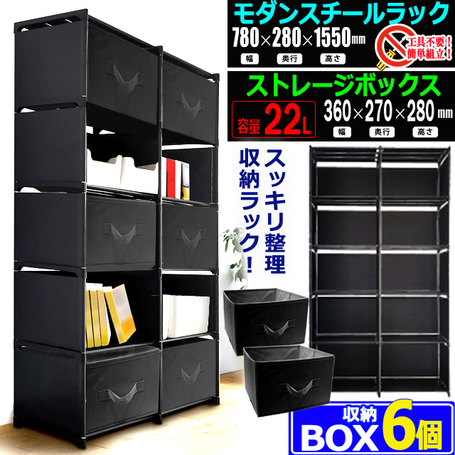 工具不要で完成!モダンスチールラック5段×2列&収納ボックス6個セット 不織布 ストレージボックス インテリアラック シンプル フリーボックス