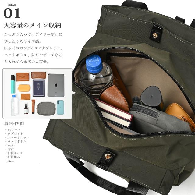 A4サイズのファイルやタブレット、ペットボトル、財布やポーチなどを入れても余裕の大容量。