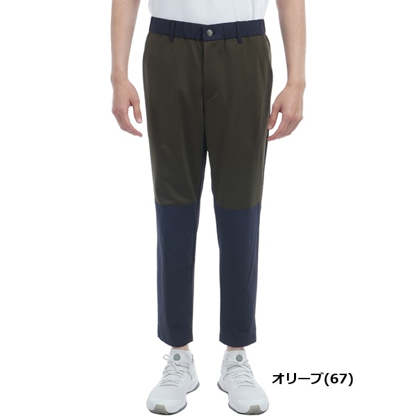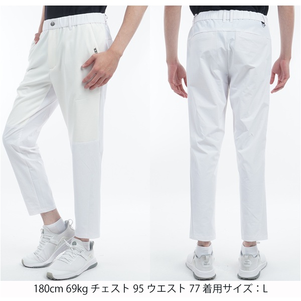 稼働率の高い太もも部分にストレッチ性の強いポンチ素材を使用し、動きやすさを確保した、ハイブリッド スウェットパンツ。 ヒップ部分は、カートなどで擦れやすいため、耐久性の高い布帛素材を採用しています。Lサイズで股下68cm。