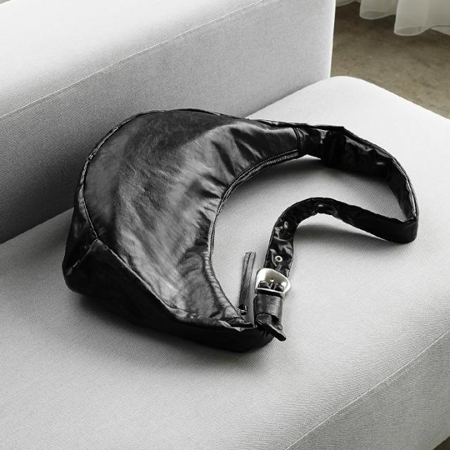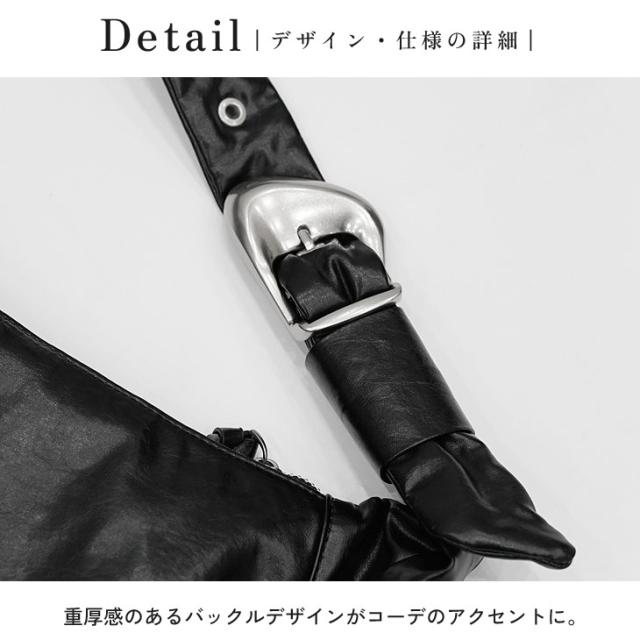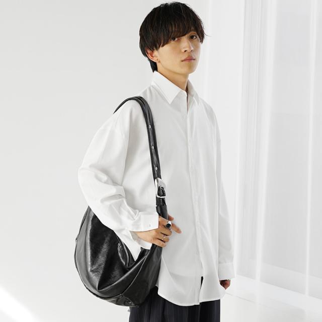 丸みを帯びたユニークなフォルムが目を引く、レザー調のワンショルダーバッグ。なめらかな質感と上品な光沢が、カジュアルにもきれいめにもマッチします。