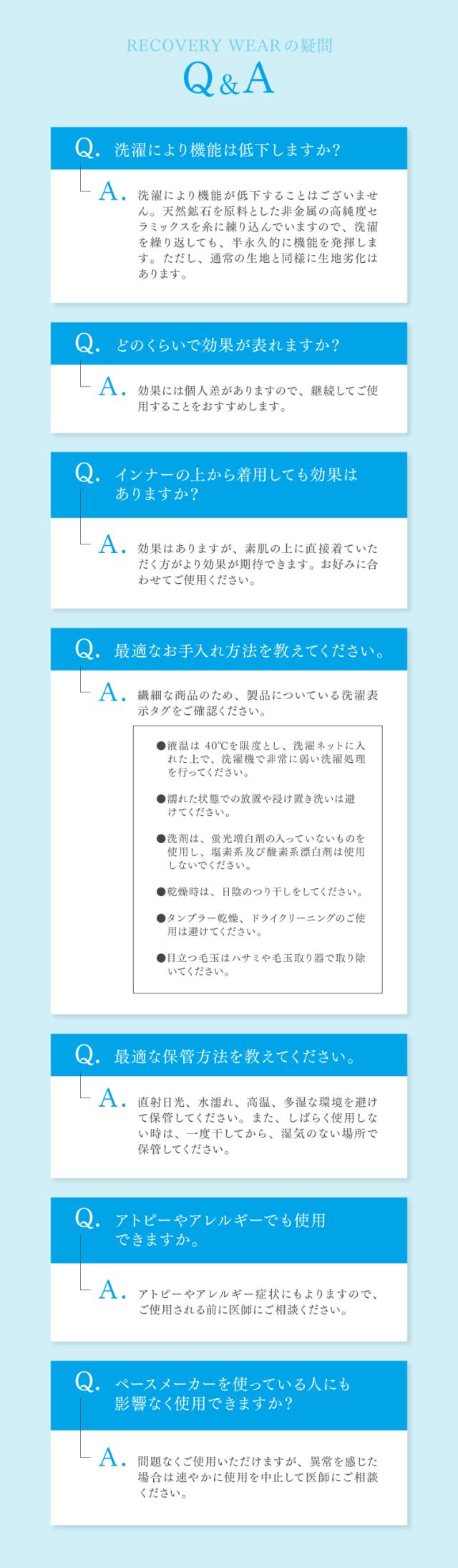 | ご使用上の注意 | ●睡眠時の着用は、発汗作用が高まりますので、十分な水分補給を行ってください。 ●着用前に洗濯することをおすすめします。 ●体質などにより、着用時肌に異常(かゆみ、かぶれなど)を起こす場合があります。異常を感じた場合は使用を中止してください。 ●素材の特性上、長時間の摩擦や揉み作用で毛玉が出来やすいのでご注意ください。目立つ毛玉ははさみや毛玉取り器で取り除いてください。 |
