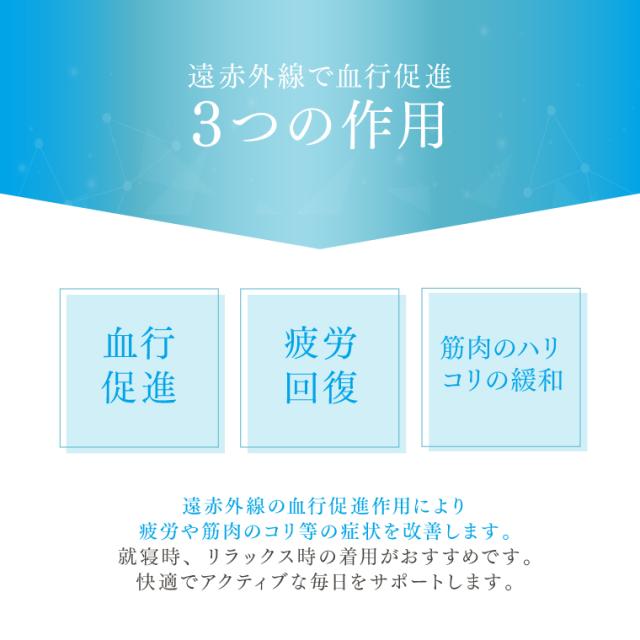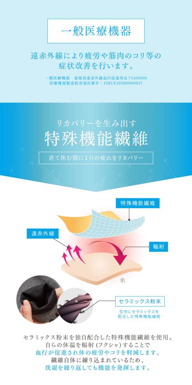 | 備考 | 【一般医療機器】 一般名称:家庭用遠赤外線血行促進用衣 71105001 医療機器製造販売届出番号:13B1X10360000037 耐用期間:2年 【禁忌・禁止】 ※湿疹、かぶれ、傷口など皮膚に異常がある時は使用しないこと。 ※異常(かゆみ、かぶれなど)を感じたらご使用を中止すること。 |