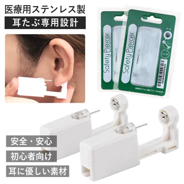 簡単・安全にピアスの穴があけられる、滅菌済ピアス穿孔器 耳たぶセーフティピアッサー 医療用のステンレス製ピアスを使用していますので、ご安心ください。