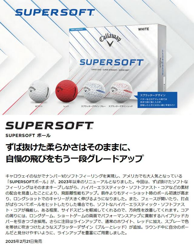 2ピース構造の「SUPERSOFTボール」は名前が表しているとおり、キャロウェイにおいてもっともソフトな打感を実現しているボールです。この心地良いフィーリングにより、アメリカではもっとも人気の高いボールの1つになっています。もちろん、リニューアルされた今回の最新仕様でも、このスーパーなソフトさは変わらずキープされています。