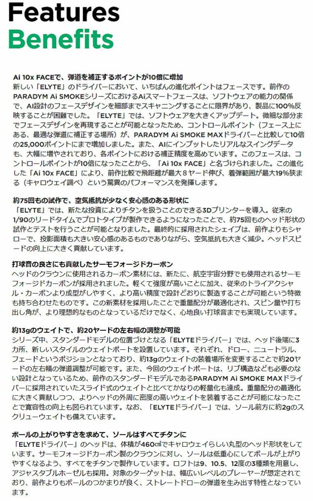 「ELYTEドライバー」のヘッドは、体積が460?でキャロウェイらしい丸型のヘッド形状をしています。サーモフォージドカーボン製のクラウンに対し、ソールは低重心にしてボールが上がりやすくなるよう、すべてをチタンで製作しています。ロフトは9、10.5、12度の3種類を用意し、アジャスタブルホーゼルも採用。対象のターゲットは、幅広いレベルのプレーヤーが想定されており、前作よりもボールのつかまりが良く、ストレートドローの弾道を生み出す特性となっています。