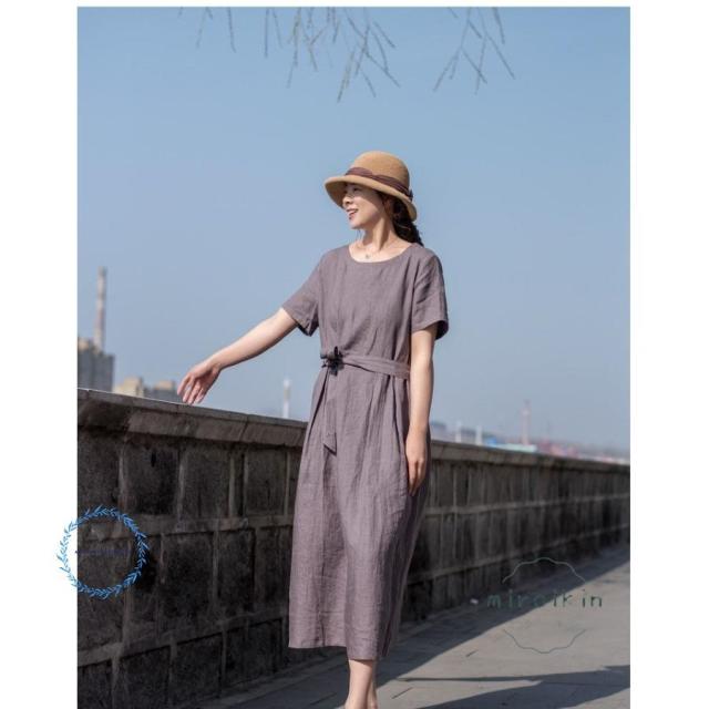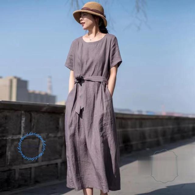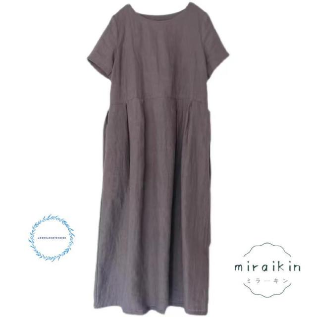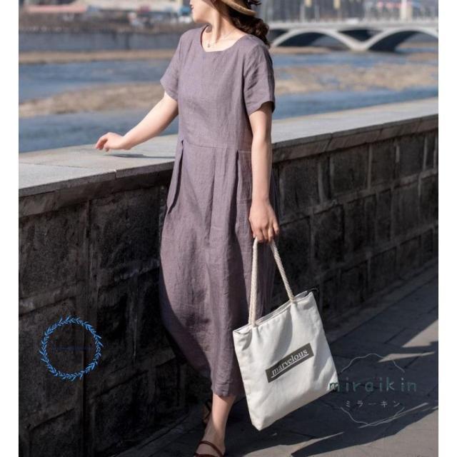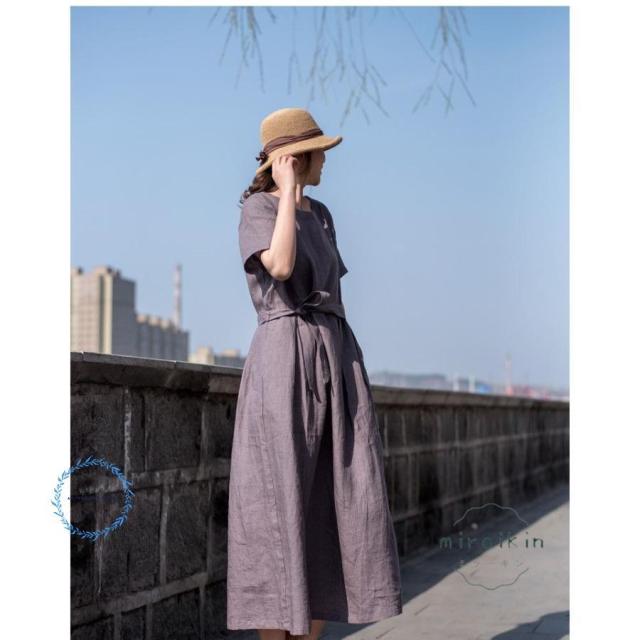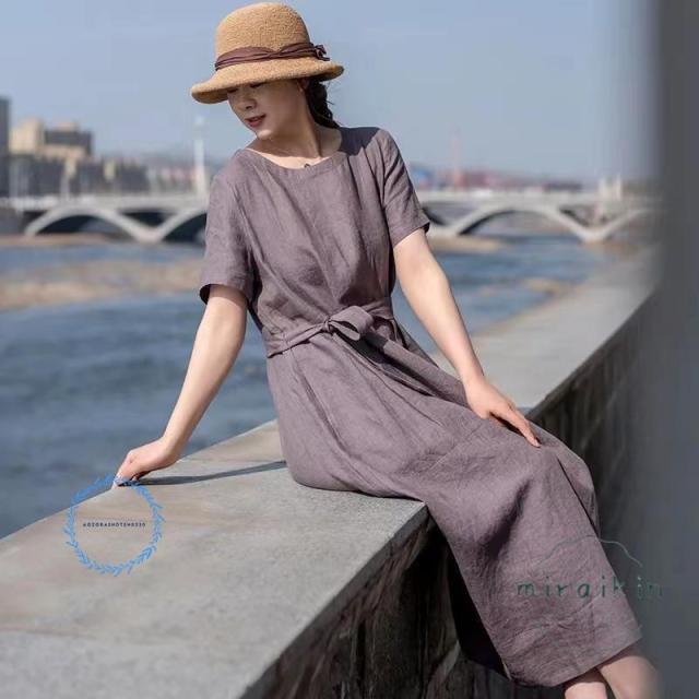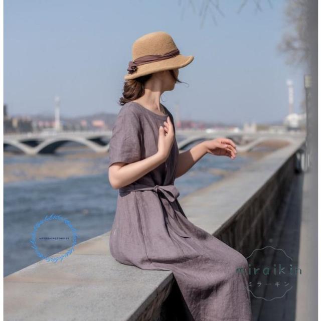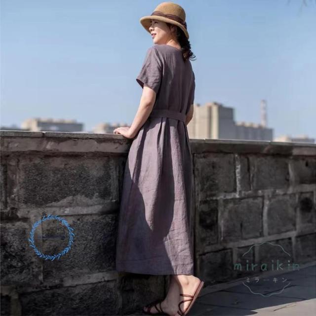 ワンピース レディース 半袖 リネンワンピース 大きいサイズ リボン付き パープル 丸首 50代60代70代 リゾート