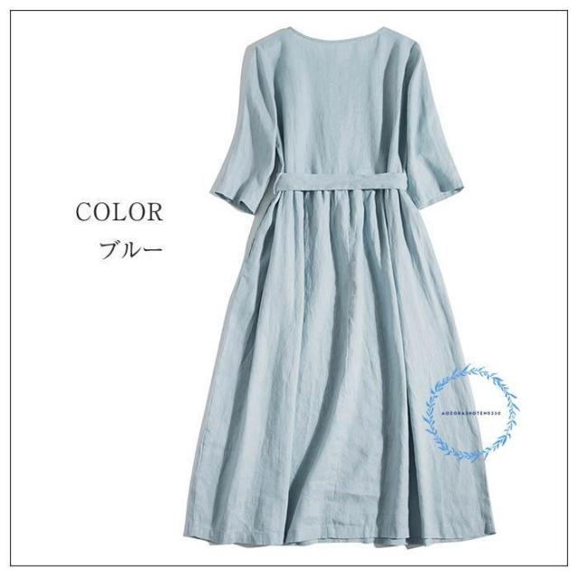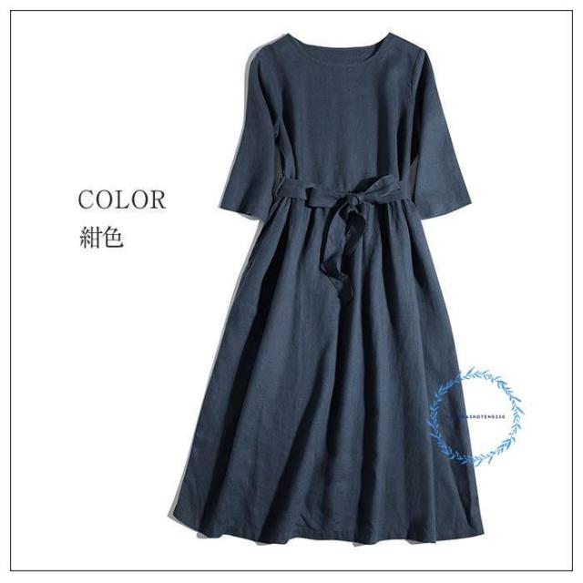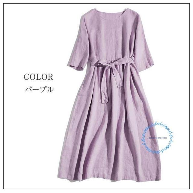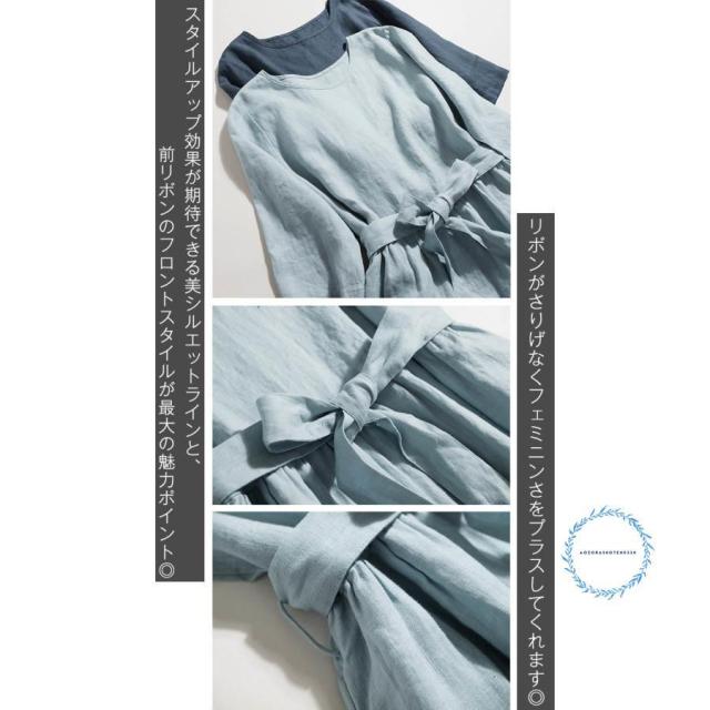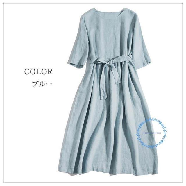 リネン100% フレア ワンピース 春 夏 aライン ワンピース 麻 半袖 フレアワンピース ロング aラインワンピース ウエストリボン付き クルーネック ゆったり リネ