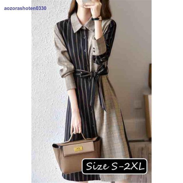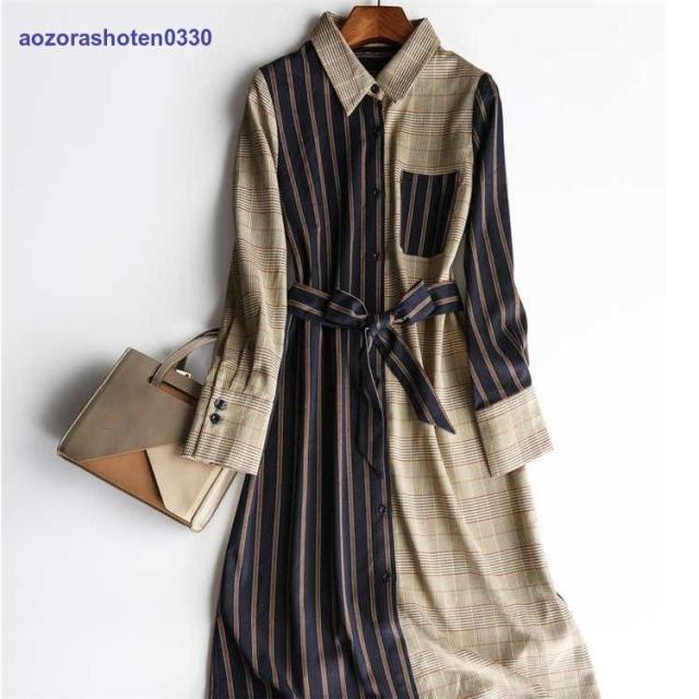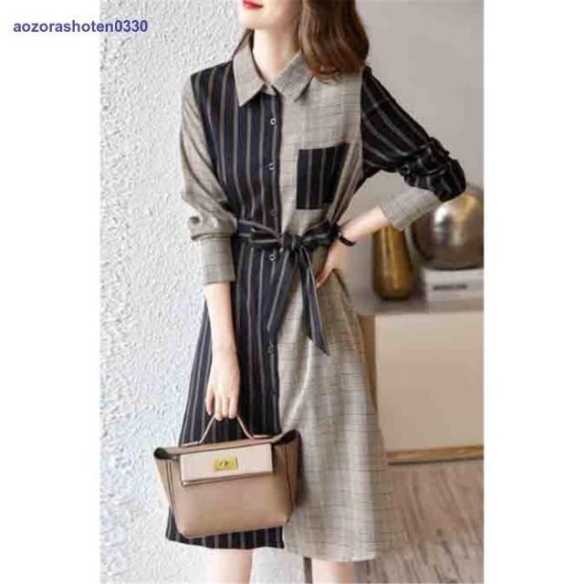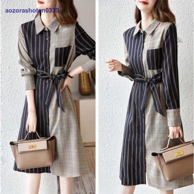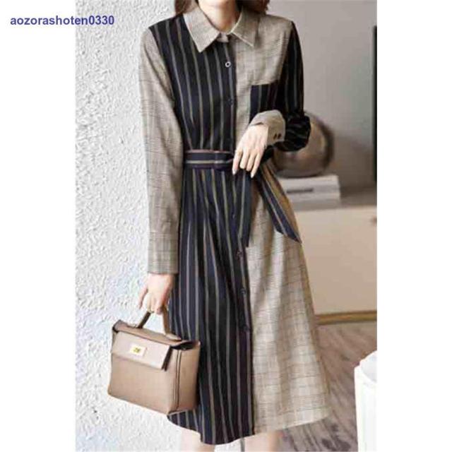 シャツワンピース レディース 40代 きれいめ 膝丈ワンピース 春秋 長袖ワンピース ボーダー柄切り替え Aラインスカート オシャレ韓国 カジュアル通勤OL 大人
