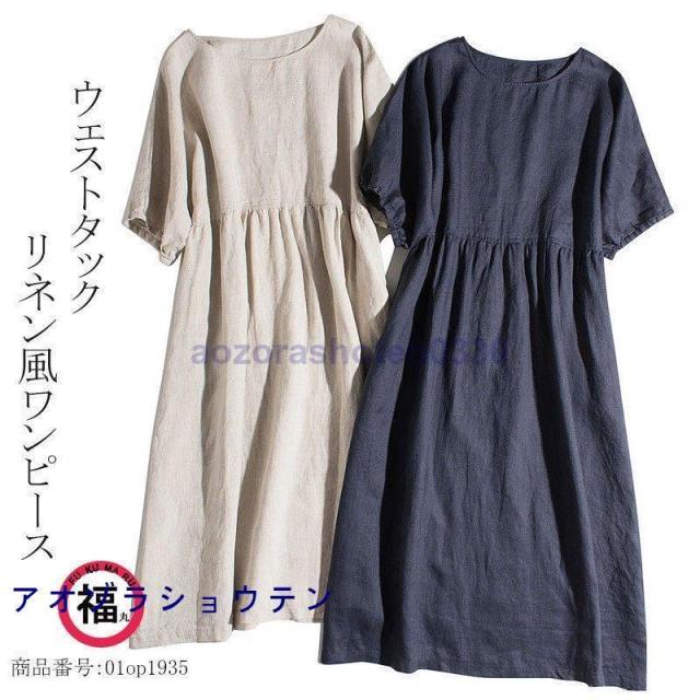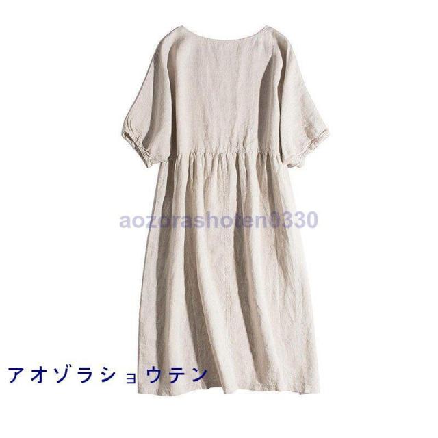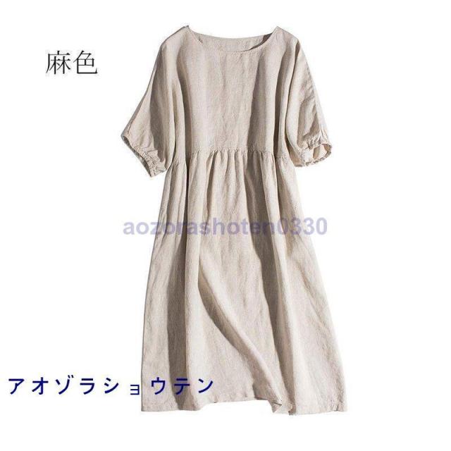 リネンワンピース レディース 春 夏 麻 ワンピース 綿麻 マキシ ロング Aライン 半袖 ワンピース 体型カバー ネイビー 麻色 40代