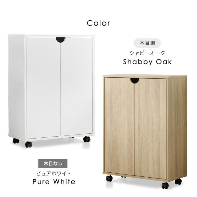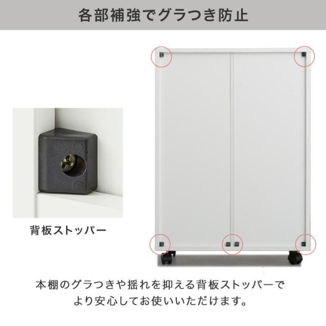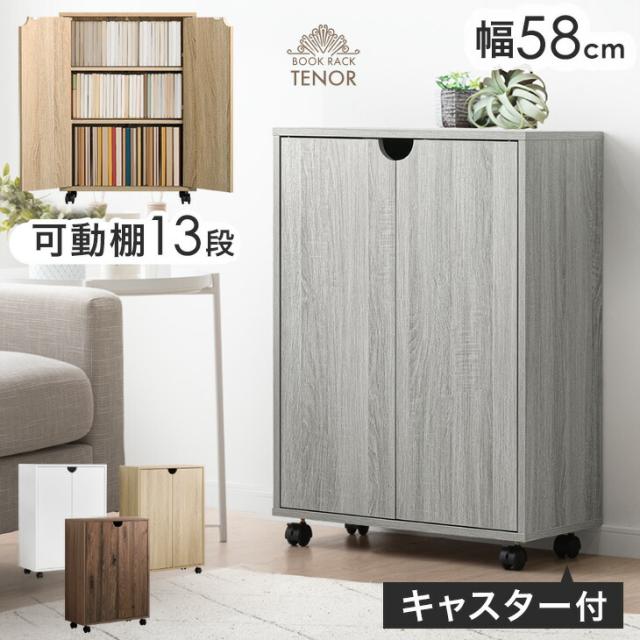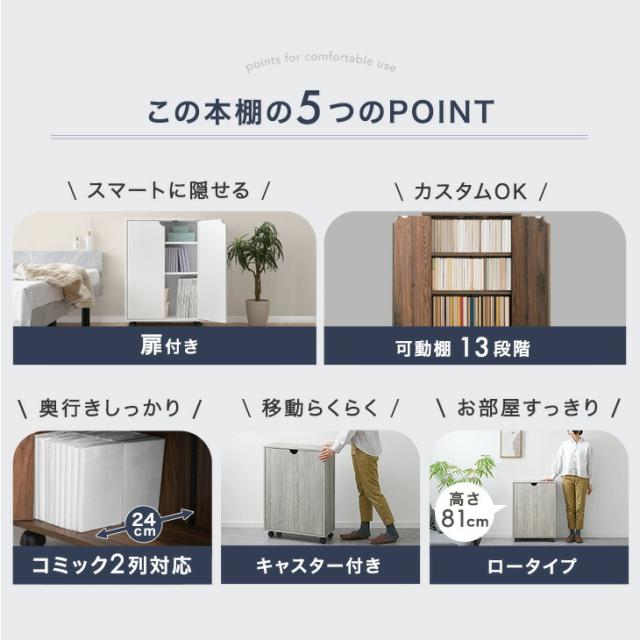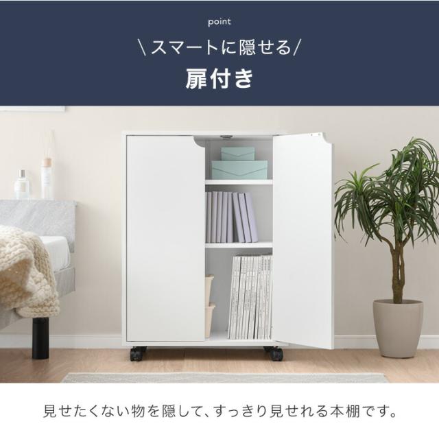 扉 & キャスター付き 本棚 扉付き ロータイプ キャスター 大容量 収納棚 スリム 可動棚 幅58 木製 漫画 収納 棚 シェルフ 本 コミック ラック ワゴン コンパクト キャスター付 移動式 扉付き収納 A4 おしゃれ 北欧