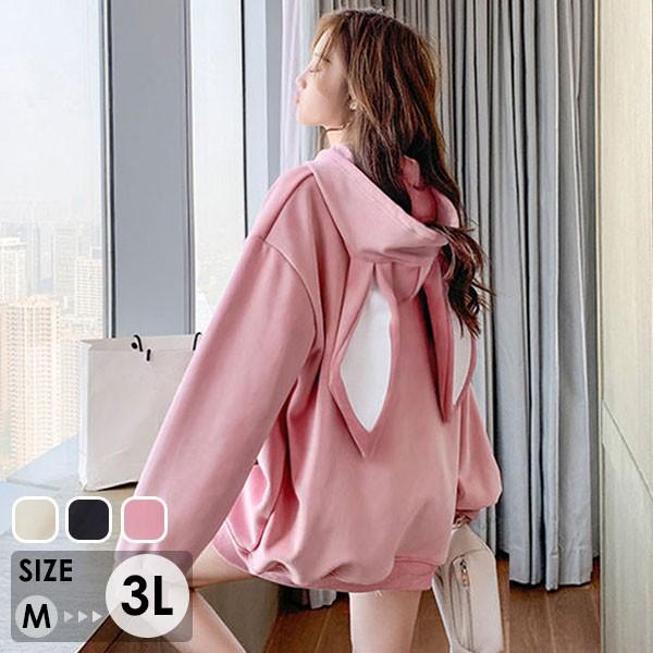 パーカー うさぎ うさ耳 兎耳パーカー ジャケット レディース ドロップショルダー トップス フード付き 長袖 ピンク 黒
