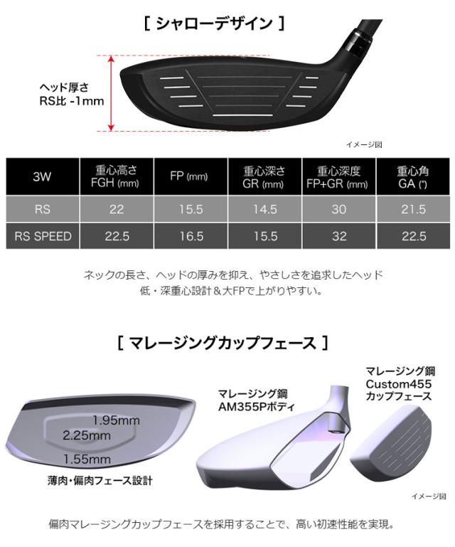RS SPEEDのフェアウェイウッドは、シャローデザイン。 ネックの長さ、ヘッドの厚みを抑え、やさしさを追求したヘッドは、 低・深重心設計&大FPで上がりやすい。