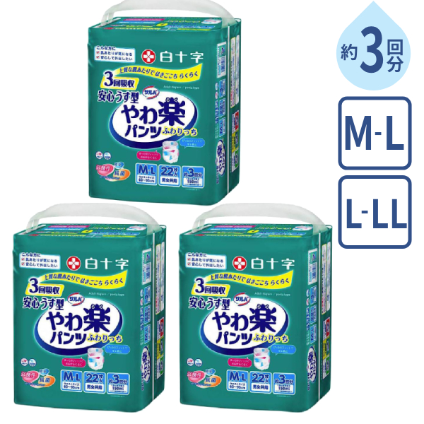 1ケース (3袋入) 大人用紙パンツ 約3回分吸収 男女兼用 サルバやわ楽パンツ 安心うす型 ふわりっち M-L:22枚 L-LL:20枚 白十字 高齢者 老人 介護 男女共用 紙おむつ パンツタイプ リハビリパンツ 介護用品