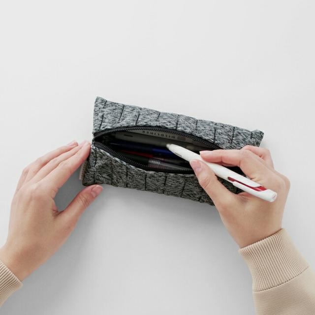 ニットと聞くと、セーターのようにやわらかさのある素材をイメージしますが、そのイメージを覆すほど、この素材は硬く、しっかりと編まれています。 素材はポリエステル100%の丈夫で軽い糸を使用。編み目が細かいため、シャーペンや定規、コンパスの先があたってもほつれません。