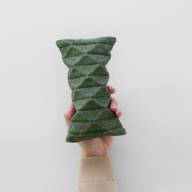 様々な色がミックスされた糸を編んで作ったマーブルタイプ。引っ張ると伸びて、つぶすとフラットに。編み目の折り線に沿って立体的な形が作れます。他とはかぶらない個性的なデザインが特徴です。