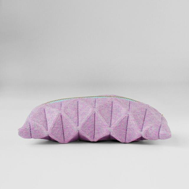 oriamiニットはポリエステル糸を編んで作ったニットのファブリックです。セーターを作るときよりも伸縮と強度を持たせ、しっかりとしたタッチに仕上げたこの編地はいつものニットにはない、ハードな質感が特徴です。ここに編み目で折れ線の模様を入れ、折れ線に沿って山折り、谷折りをくり返すとまるで折り紙のように立体的に形を作ることができることから、oriami(おりあみ)と名前をつけました。