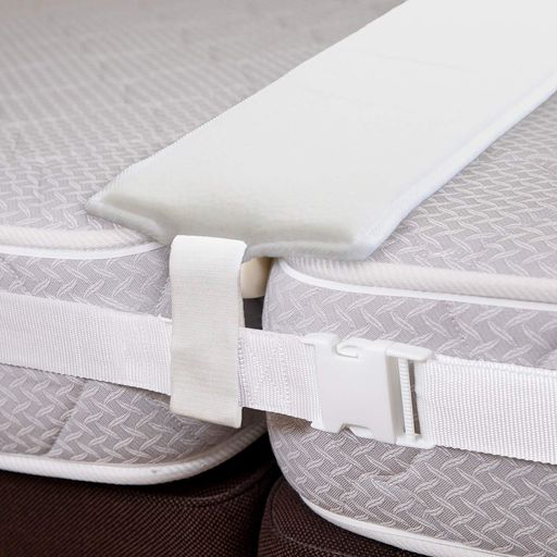 【2つの人気商品がセットになったお得パッケージ】2枚のマットレスをしっかりと固定する「マットレスバンド」と、2枚のマットレスの間にできる隙間を埋める「すきまパッド」。2つの人気商品がセットになったお得なパッケージです!セットになっている連結バンドをマットレス全体に一周させることで、マットレス同士のズレを防ぐことができます。また、すきまパッドにはバンドを通す紐が付いており、バンドを締めることでしっかりと固定します。