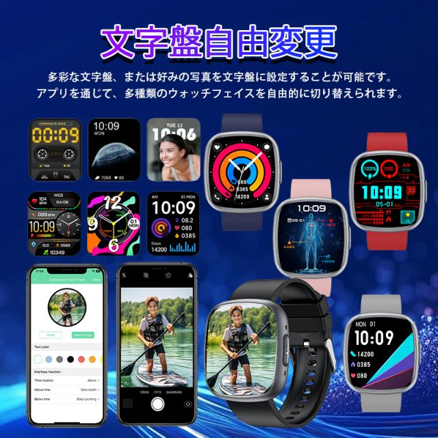 このスマートウォッチは業界初の1.75インチ大画面のタッチパネルを採用し、老眼の方にも見やすい!画質がより鮮明になり、高精度な大画面で通知や文字が一目瞭然に表示される。上下左右のスライド操作で機能の切替も簡単です。本体で6つの表盤画面搭載する以外、専用アプリで50+種類の文字盤を自由に設定することができます。他に、家族、恋人、アイドル、及びペット等の好きな写真も文字盤に設定可能で毎日新鮮さを味わえる。